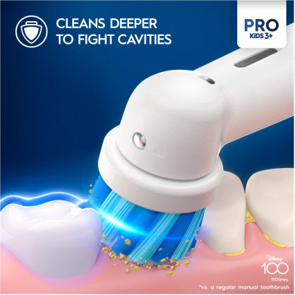 Oral-B Pro Kids zobu birstes galviņa tīra dziļāk, lai cīnītos pret kariesu salīdzinājumā ar standarta manuālo zobu birsti