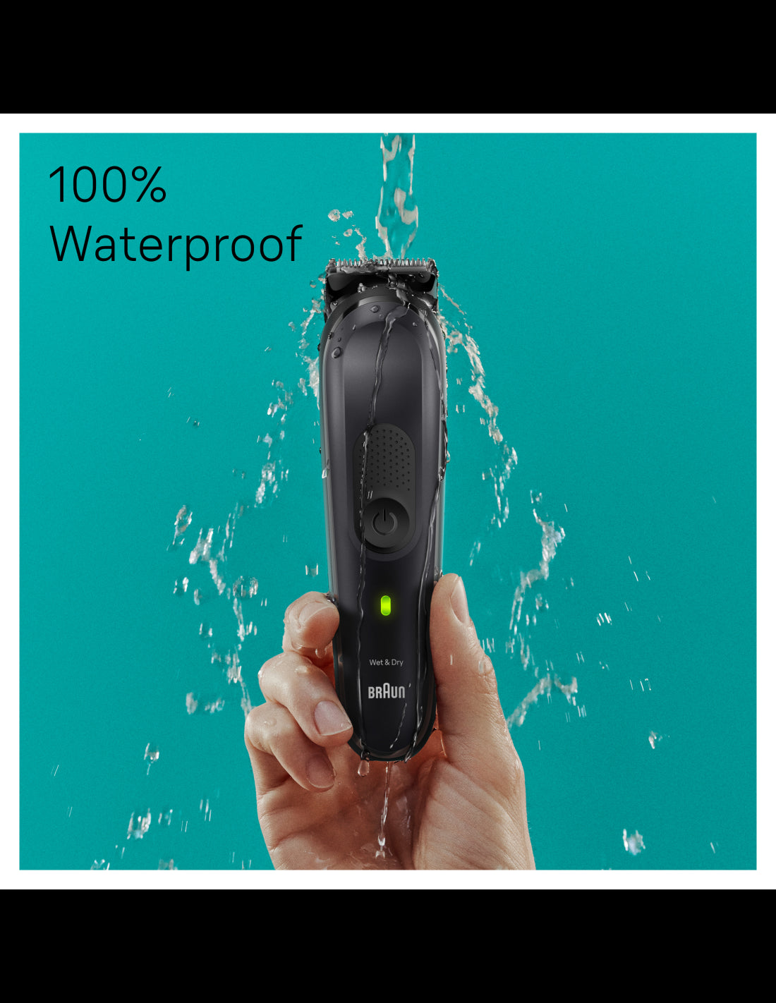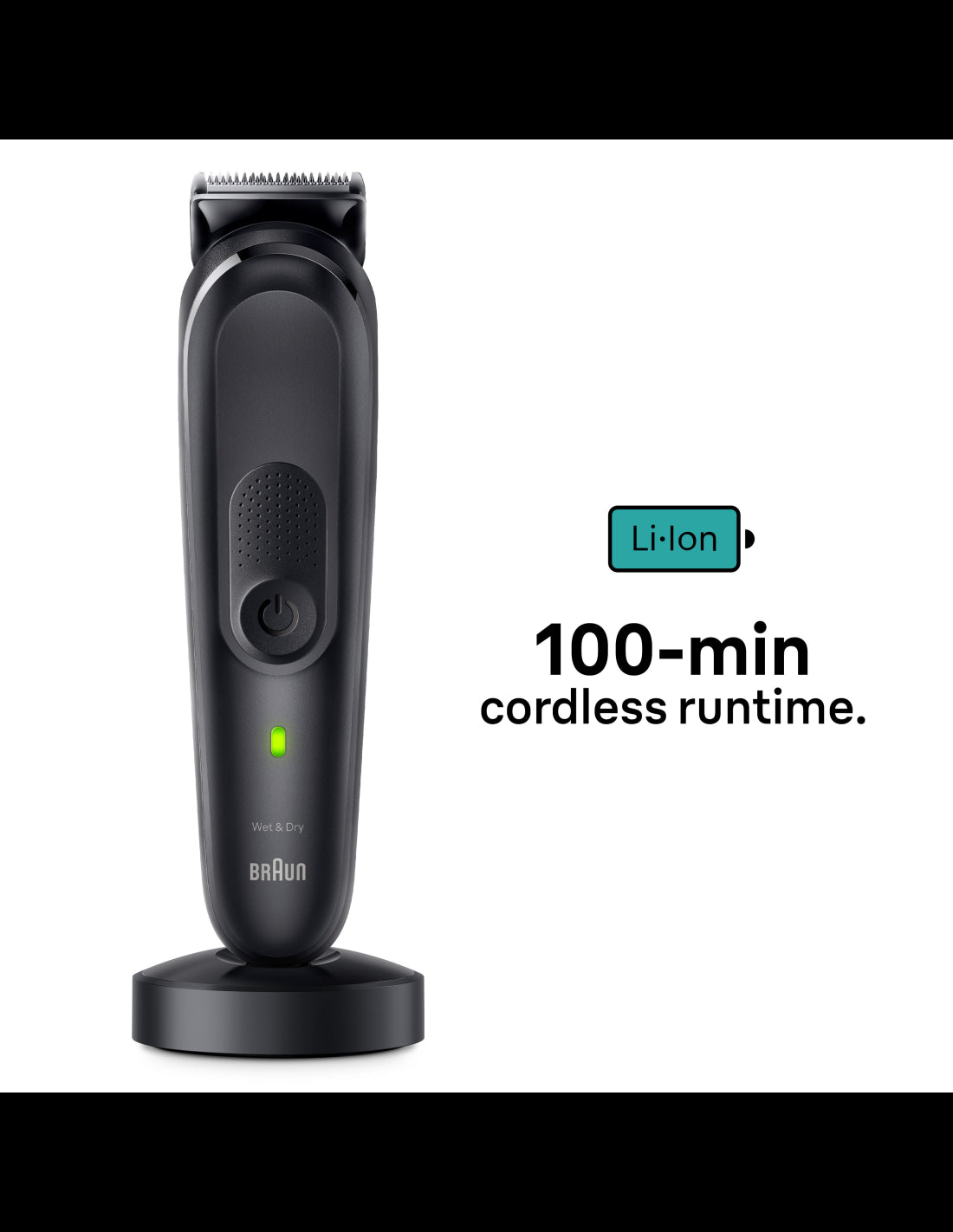 Izstrādāts tā, lai tas būtu izturīgs: šim vīriešu kopšanas komplektam ir jaudīgs litija jonu akumulators ar 100 minūšu bezvadu darbības laiku, asiem asmeņiem visa mūža garumā un tas ir 100% ūdensnecaurlaidīgs.