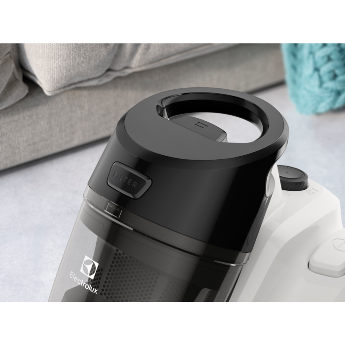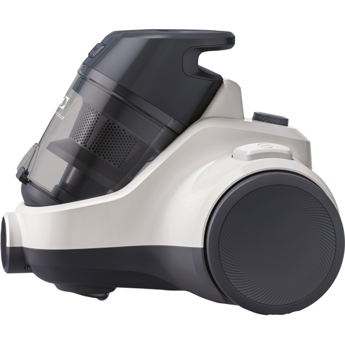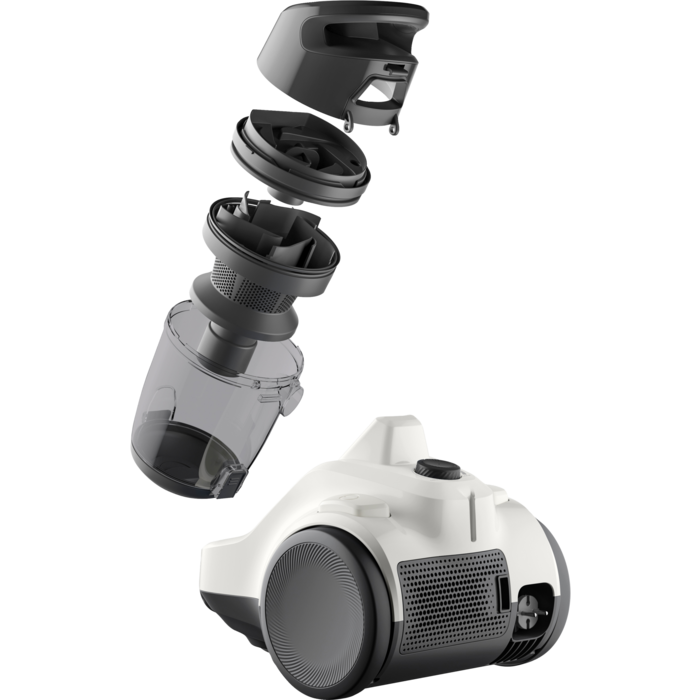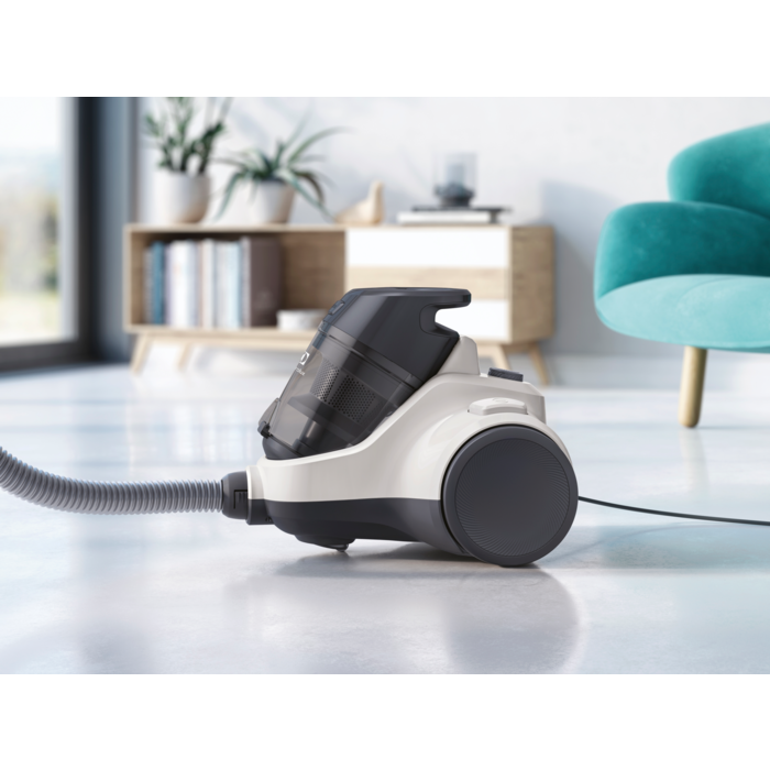 EASE C4, bez putekļu maisiņa, konteinera ietilpība 1.8l, 750W, telesk. caurule, DustTrap uzgalis, mazgājams Hepa E12 filtrs, 7m darb. rādiuss, mīksti riteņi, 80dB, maigi baltā krāsā, 7.27kg