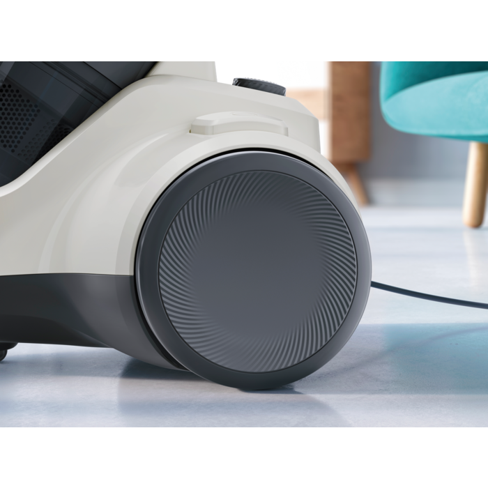 Lieli rotējoši riteņi neļauj putekļu sūcējam aizķerties, uzlabojot tā stabilitāti un manevrētspēju visā mājoklī.