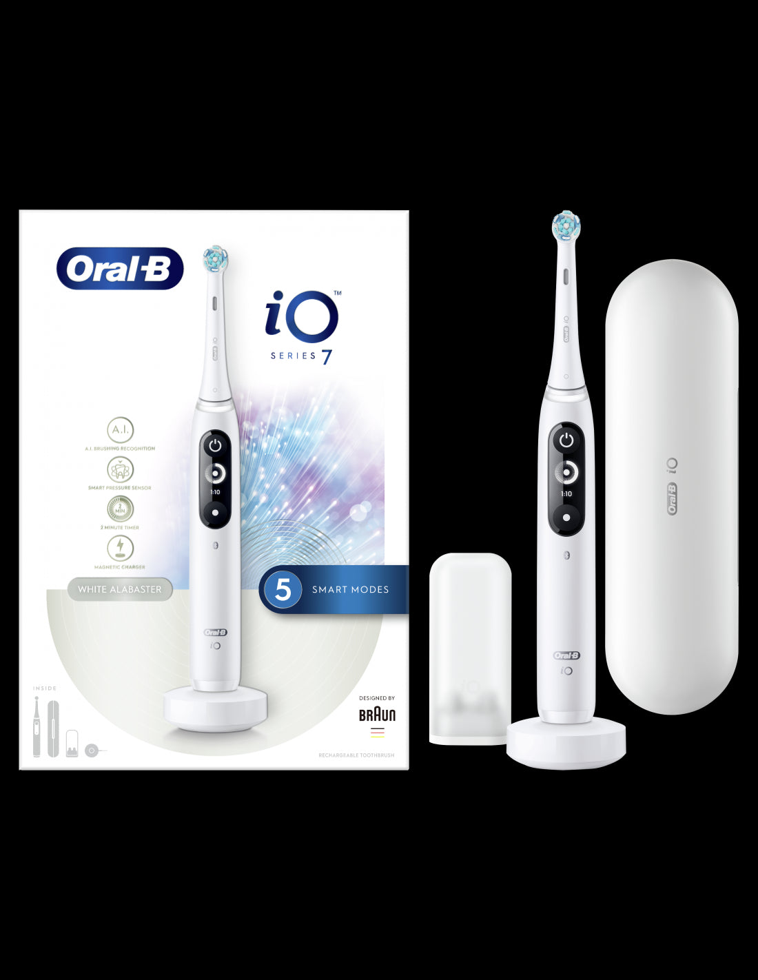 iO is Oral-B's best brushing technology, combining the steady energy of micro-vibrating bristles with the dentist-inspired Oral-B round toothbrush head. It is powered by the world's first uniaxial magnetic drive system