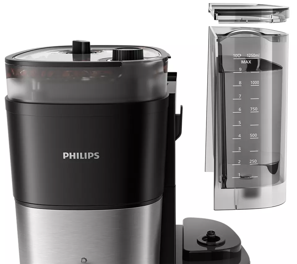 Removable double bean hopper with Aroma Seal system allows you to store and mix two different blends together. You can also switch from decaffeinated to regular coffee mode. It is easy to clean, i.e. see thanks to the included brush, as well as easy refilling.