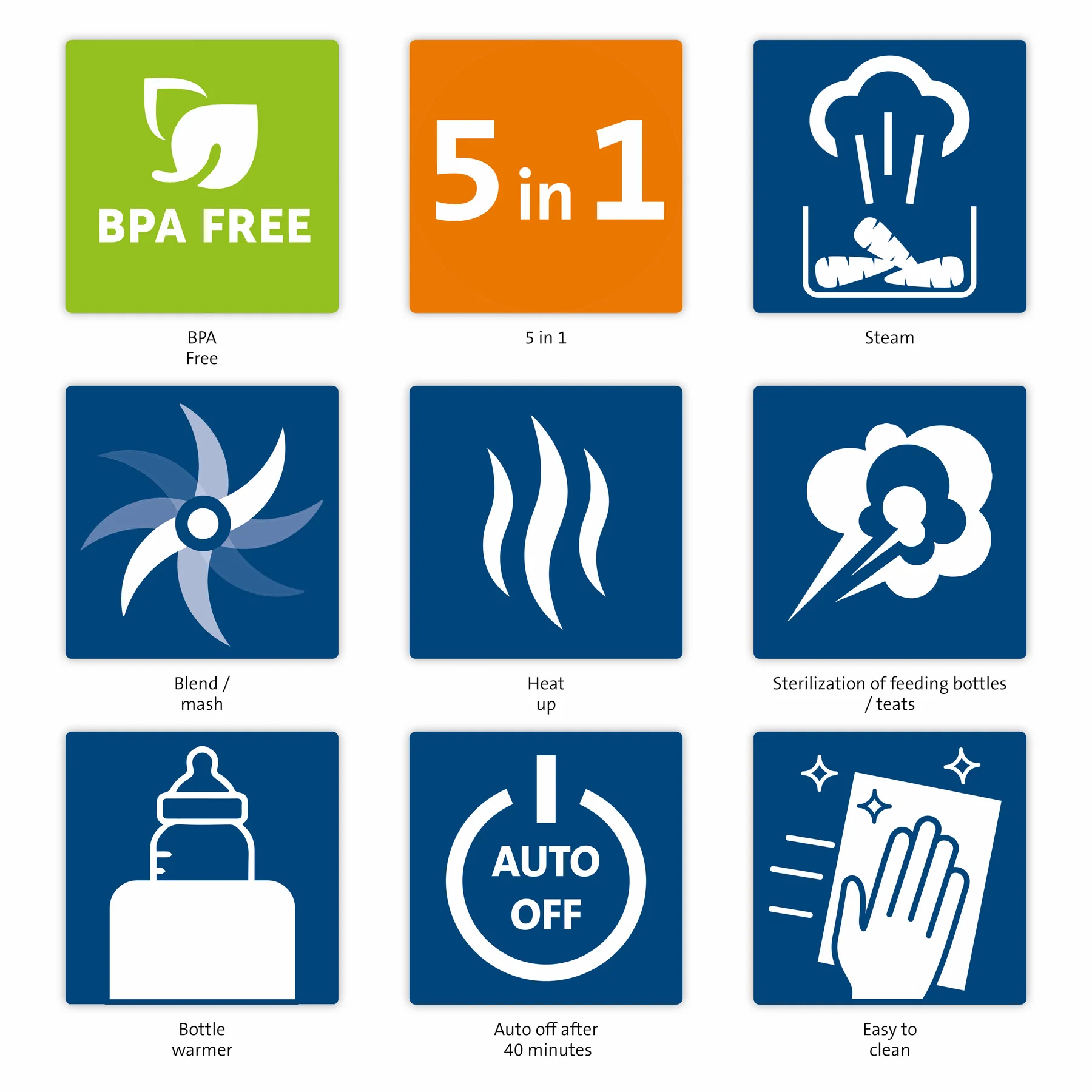 - 5 funkcijas: tvaicēšana, ēdiena biezenīša pagatavošana, sildīšana, pudelīšu sildīšana, pudelīšu/knupīšu sterilizēšana