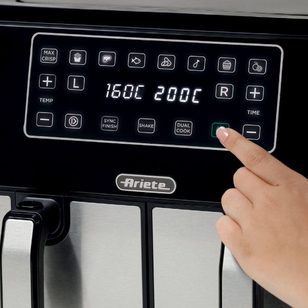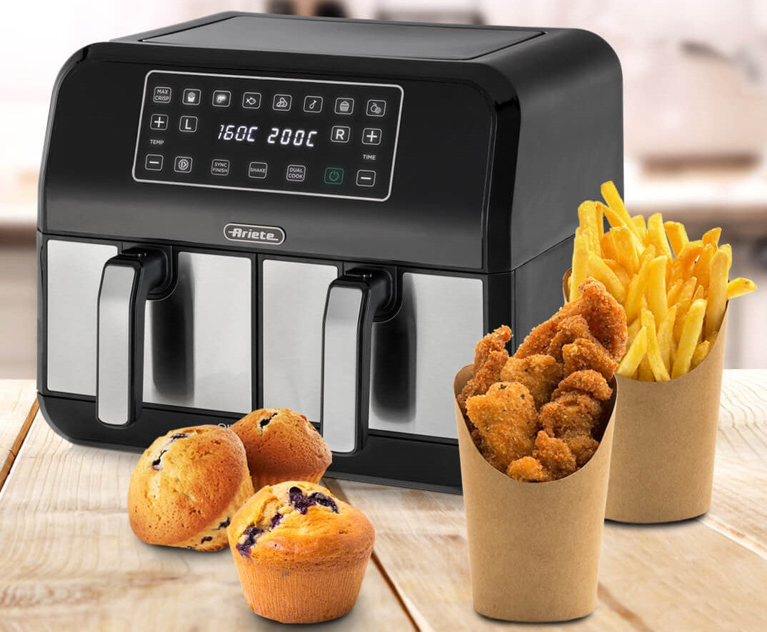 Ar Airy Fryer Dual Metal gaisa friteri variett cept jebkuru ēdienu dubultā daudzumā, izmantojot tikai vienu ēdamkaroti eļļas, lai vienlaikus iegūtu veselīgu un garšīgu cepšanu un maltītes pagatavošanu. Pateicoties 2 atsevišķiem groziem, katrs 4 l, ar Ariete Airy Fryer Dual Metal vienā piegājienā varat pagatavot līdz 3,4 kg frī kartupeļu! Bez Frī kartupeļiem variet pagatavot arī kroketes, zivis, gaļu un daudzus citus panētus ēdienus,tajā skaitā arī saldētos un cepšanai gatavos produktus, gan svaigos un tikko panētus, pateicoties 8 iepriekš iestatītām programmām.