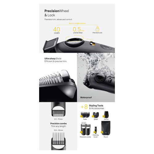 - PrecisionWheel & Lock Nevainojama veidošana jebkurā garumā. Uzlabota kontrole, lai nebūtu nekādas noslīdēšanas