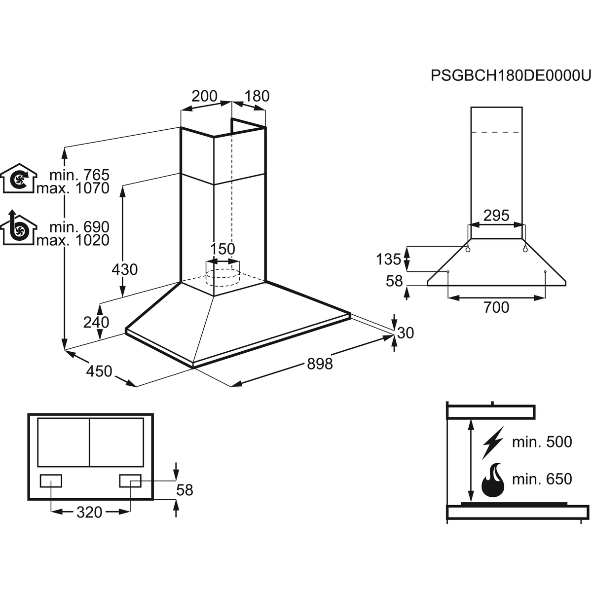 Uzstādīšanas veids: dūmvada tipa, platums 90cm