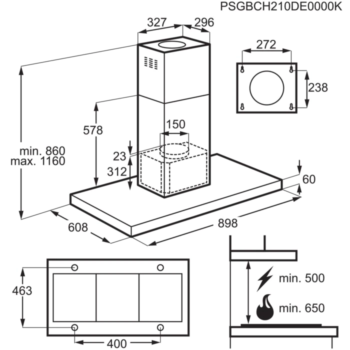 Nosūkšanas jauda (maks./min.): 400 / 250 m³/h