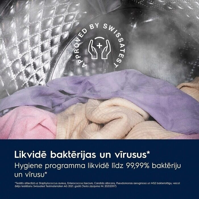 Higiēnas programma, ko sertificējusi Swissatest, apvieno mazgāšanas ciklu un tvaiku, lai noņemtu vairāk nekā 99,99% baktēriju un vīrusu* temperatūrā virs 60°C. Arī tīrām drēbēm putekšņu un alergēnu daudzums pēc katras mazgāšanas tiek samazināts.