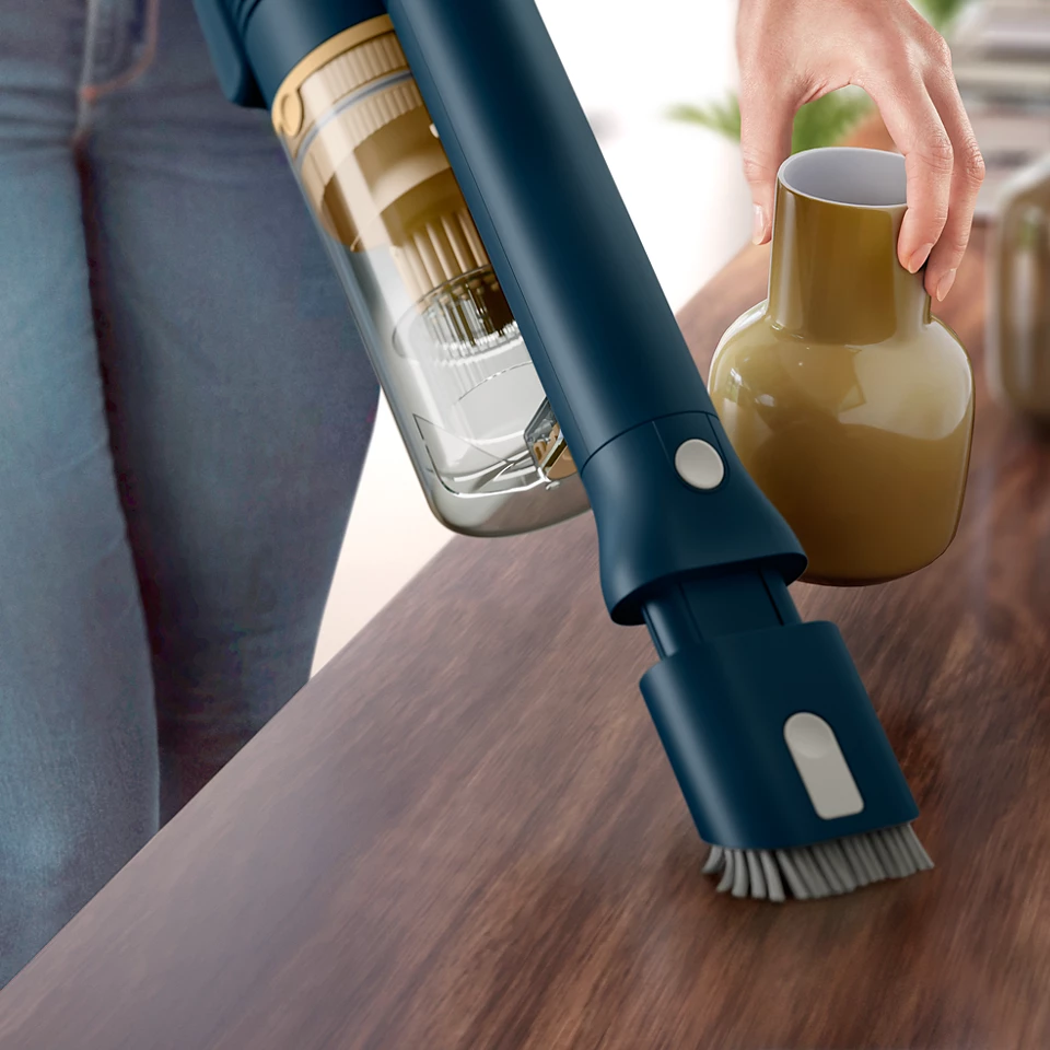 Ierīcē iestrādāta “2-in-1” funkcija un šaurās vietās ievietojams uzgalis, lai jūs varēti notīrīt dažādas virsmas un grūti sasniedzamas vietas.