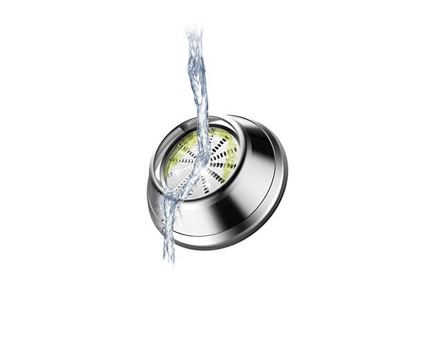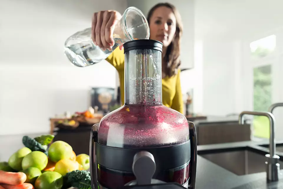 Philips unikālā priekštīrīšanas funkcija ļauj ātri noskalot sulu spiedi starp divu dažādu sulu gatavošanas reizēm vai pēc sulu spiešanas. Ielejot ūdeni bīdnī, rodas ūdens strūklaka, kas aizskalo nevēlamās atliekas.