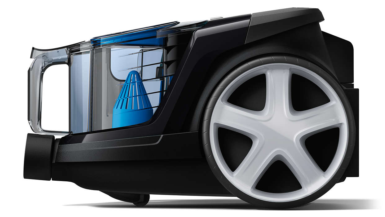 Ekskluzīvā PowerCyclone 5 tehnoloģija strauji pūš gaisu cikloniskajā kamerā, lai atdalītu putekļus. Spēcīgā virpuļojošā darbība palielina gaisa plūsmu un veiktspēju, lai panāktu ievērojamus tīrīšanas rezultātus.