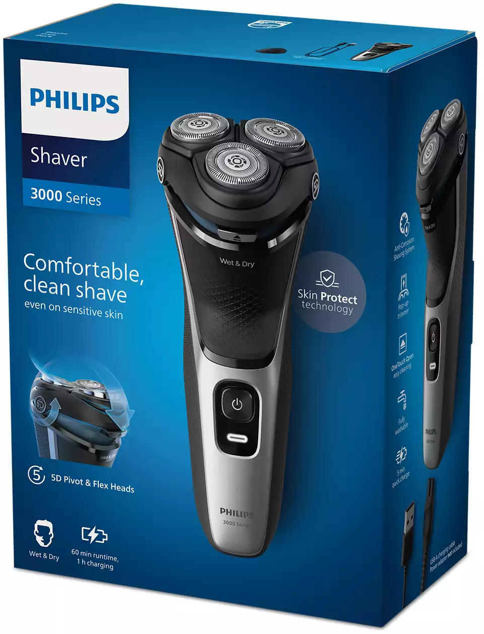 Philips Shaver 3000 sērijas elektriskais skuveklis mitrai un sausai skūšanai gādā par ērtu un gludu skūšanos pat uz jutīgas ādas. 5D kustīgās un pielāgojamās galviņas, 27 pašasinošie PowerCut asmeņi un mitrā un sausā izmantošanas iespēja katru reizi nodrošina izcilus un uzticamus rezultātus