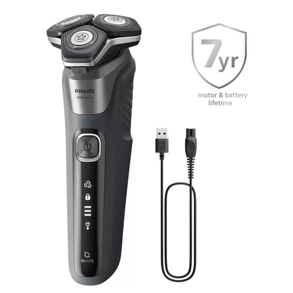 Philips Series 5000 skuveklis palīdz efektīvi noskūties, tagad ar katru kustību nogriežot vēl vairāk matiņu*. Ar uzlaboto SkinIQ tehnoloģiju aprīkotais skuveklis konstatē matiņu biezumu un tam pielāgojas, ādai sniedzot vairāk komforta.