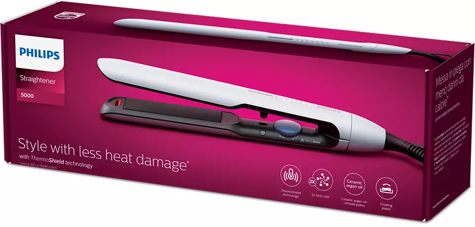 Ieveidojiet matus ar ThermoShield tehnoloģiju. Pastāvīga temperatūra no matu saknēm līdz galiņiem, mazāk karstuma radītu bojājumu un veselīga izskata mati. Pastipriniet matu mirdzumu ar 2 x jonisko aprūpi, kura ļauj izveidot daudz skaistu frizūru, kas nepūkojas.