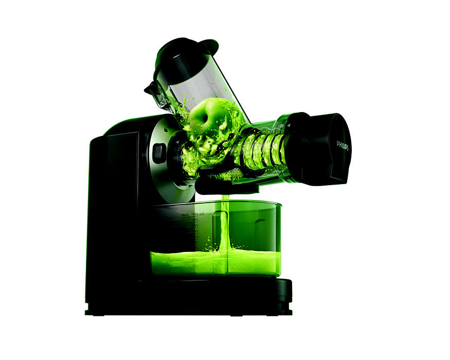 Iemalkojiet glāzi savas ikdienas veselīgās sulas. Philips zemo apgriezienu sulu spiede ir izcila sulu spiede. Šai lēnajai sulu spiedei ir XL izmēra padeves caurule, tāpēc jūs varat izspiest sulu no veseliem augļiem, dārzeņiem un lapu dārzeņiem. Skalošana aizņem vien 90 sekundes.