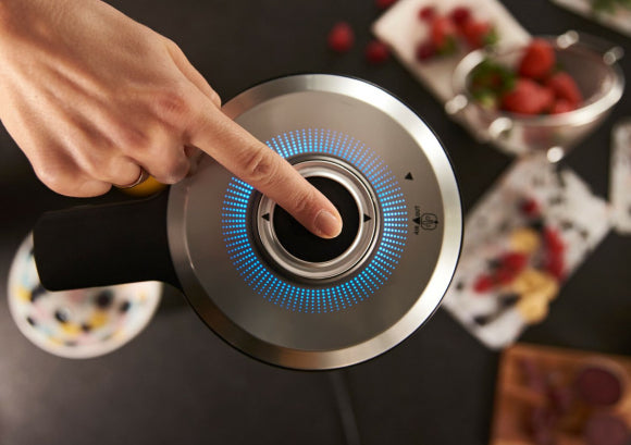 Inteliģenta krūzes atpazīšana, lai ekrāns pielāgotos krūzes veidam: zils ekrāns - varat gatavot aukstās receptes; oranžs ekrāns - varat gatavot karstas receptes