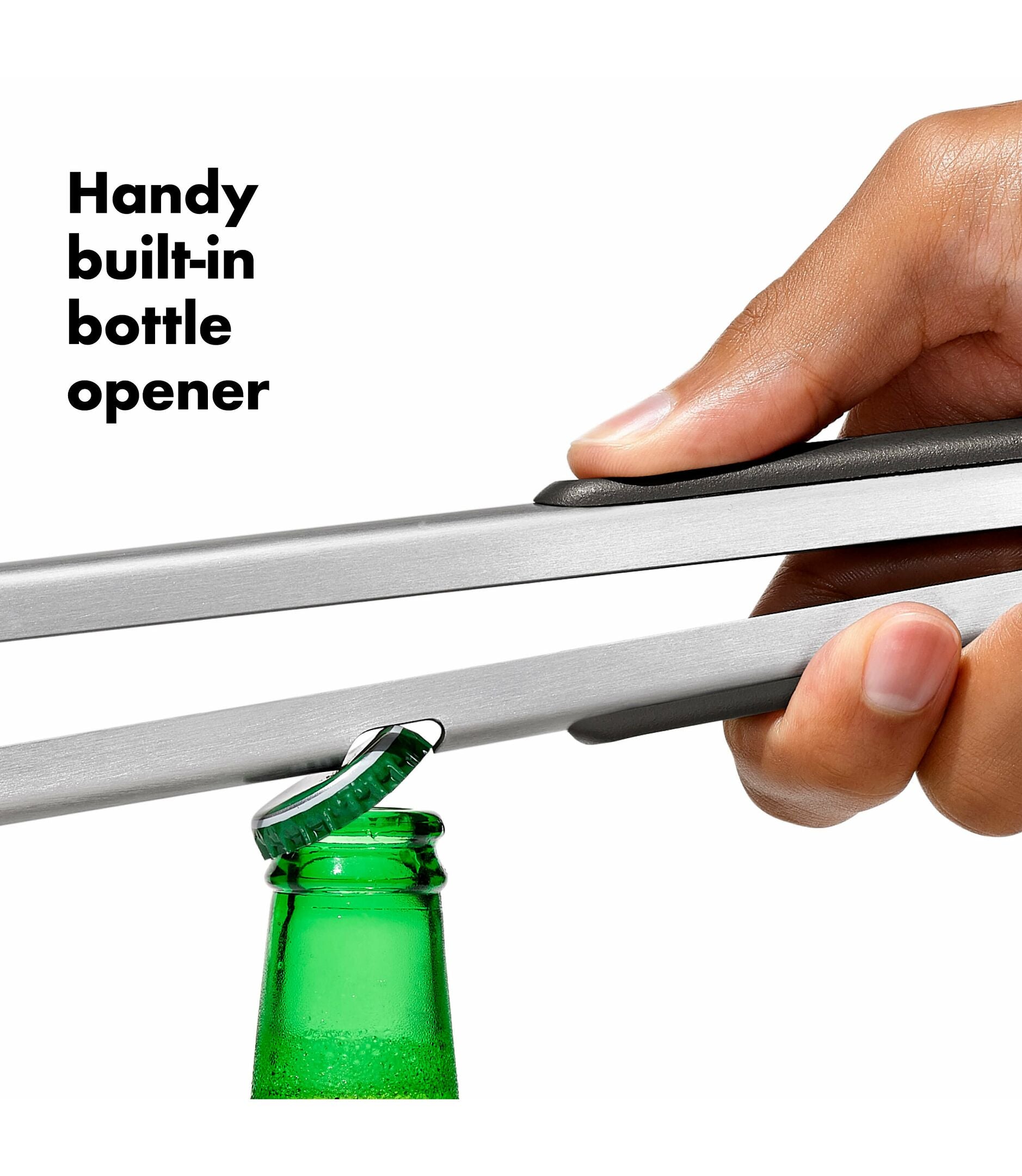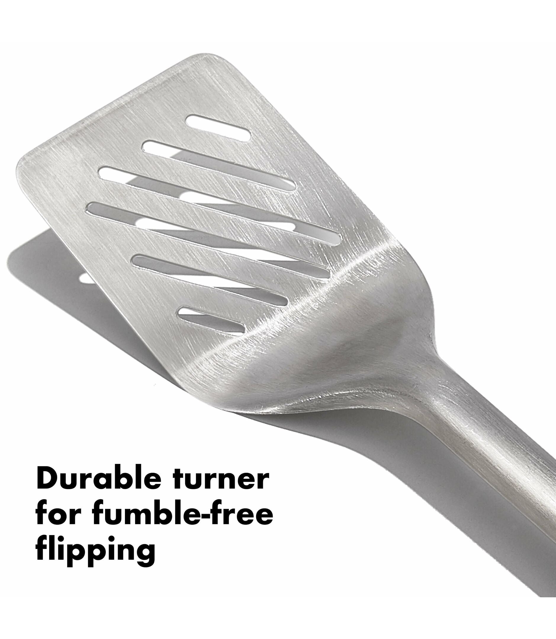 The Grilling Turner and Tongs Set is the perfect duo for any grilling task. The turner features a double-bend design for leverage while flipping and non-slip grips for a comfortable grip. The tongs feature a scalloped edge for gripping food for turning and feature a built-in bottle opener for convenient use while cooking. The stainless steel tongs and turner are dishwasher safe.Features Durable stainless steel turner is perfect for flipping burgers on the grill Wide, beveled head seamlessly slides under foods Turner’s double-bend design provides leverage for lifting Non-slip grips for a secure hold Hanging ring for convenient storage