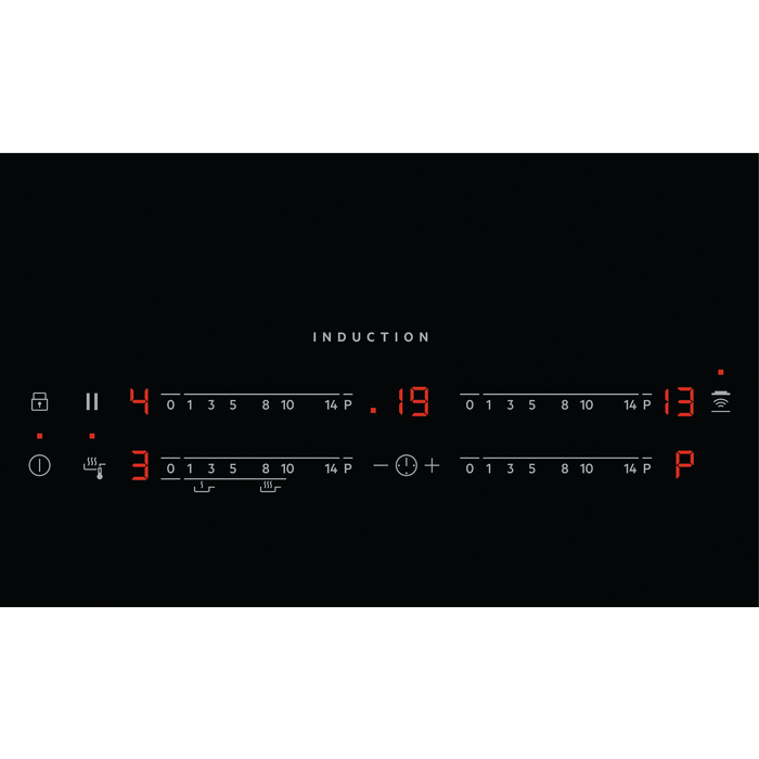 Vadības funkcijas: 3 pakāpju atlikušā siltuma indikācija, skaņas signāls, automātiskā uzkarsēšana, jaudas pastiprināšana, bērnu drošība, laika uzskaites taimeris, eko taimeris, virsmas savienojums ar nosūcēju, taustiņu bloķēšana, laika atskaites taimeris, pauze, SenseCook Fry, izslēgt skaņu, taimeris