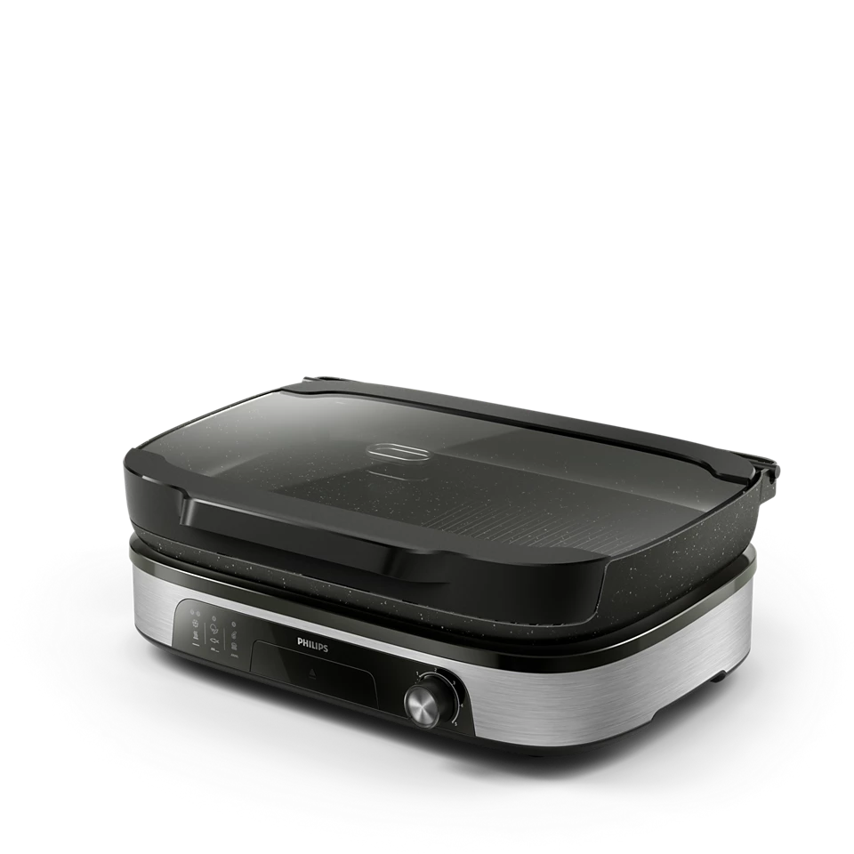 Gatavo izcilus grilētus ēdienus mājās ar Philips galda grilu. No dūmu aromāta līdz mīkstiem steikiem — stikla vāks pilnvērtīgi saglabā ēdienu garšu gardām grilētām maltītēm.