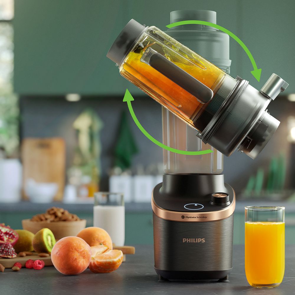 Jaunais Philips Flip & Juice blenderis ir mūsu pirmais liela ātruma blenderis ar sulas spiešanas moduli. Pateicoties revolucionārajam trauka dizainam un iebūvētajam filtram, varat iegūt jūsu ģimenes vēlmēm atbilstošu dzēriena konsistenci. No nevainojami maigiem smūtijiem līdz dzidrām un biezām sulām — mūsu uzlabotais blenderis piedāvā plašu daudzveidību. Vienā risinājumā ir apvienota blendēšana un sulas spiešana, tādējādi aizņemot mazāk vietas jūsu virtuvē.